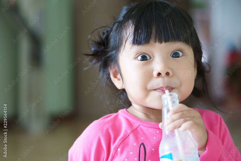 Asian Child Cute Or Kid Girl Enjoy Drinking Water Or Soy Milk Beverage And Milkshake In